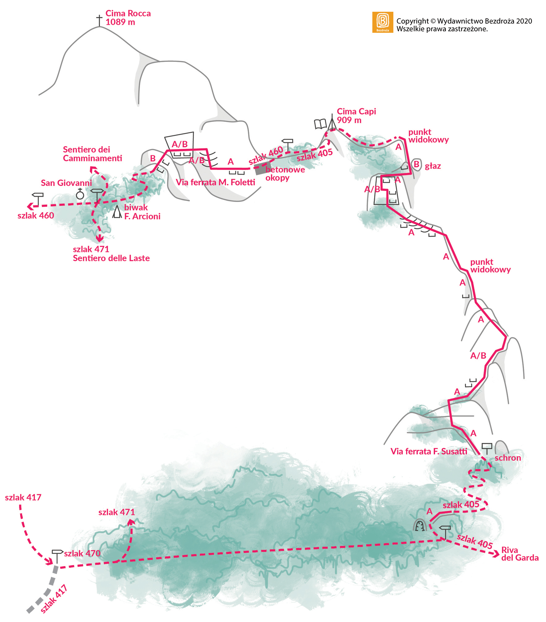 From parking go 417 -> 470 -> 471 (ferrata Sentiero delle Laste) to Bivac F. Arcioni. Pass the bivak and ferrata start 200 meters away from Bivac.